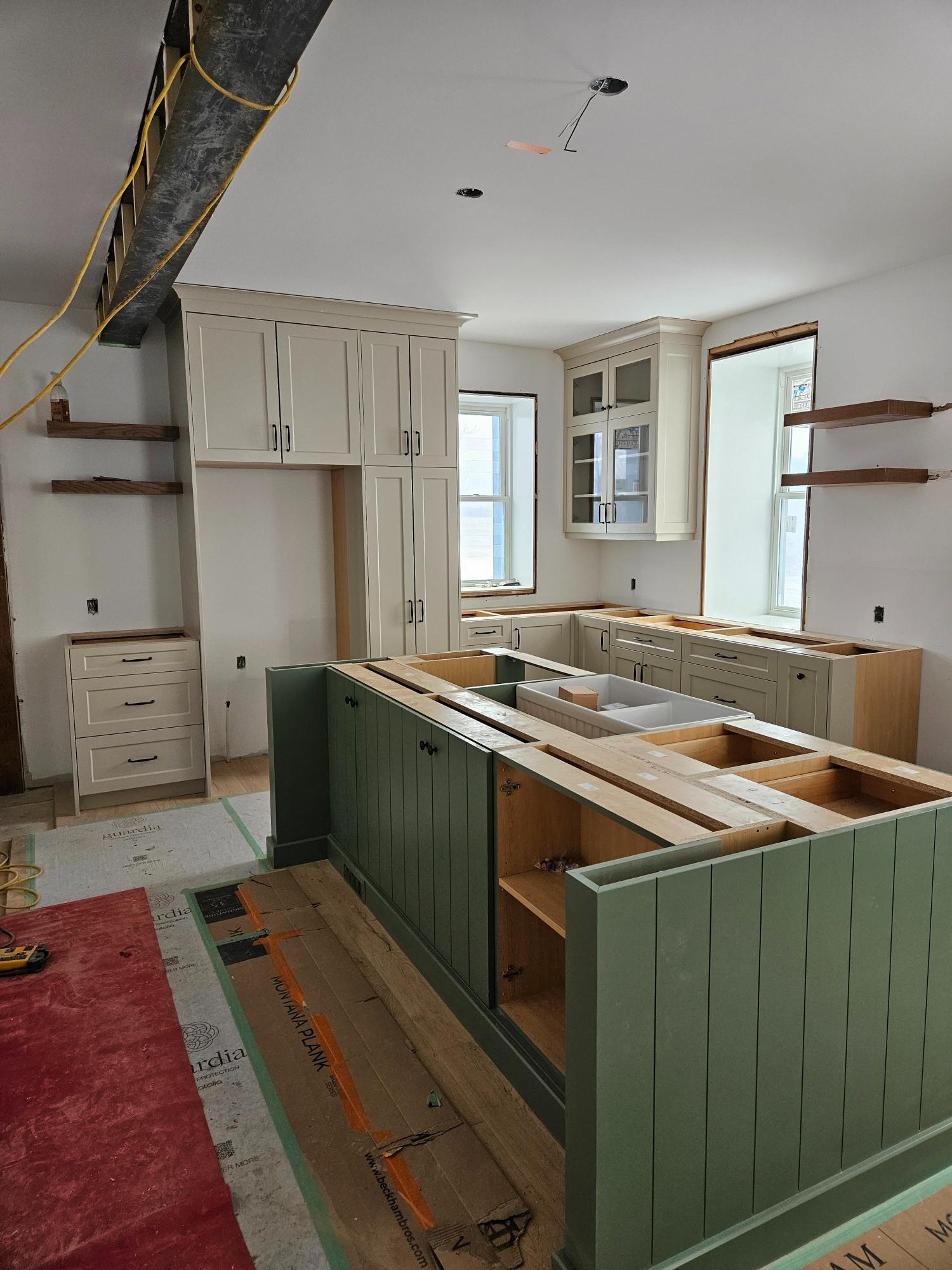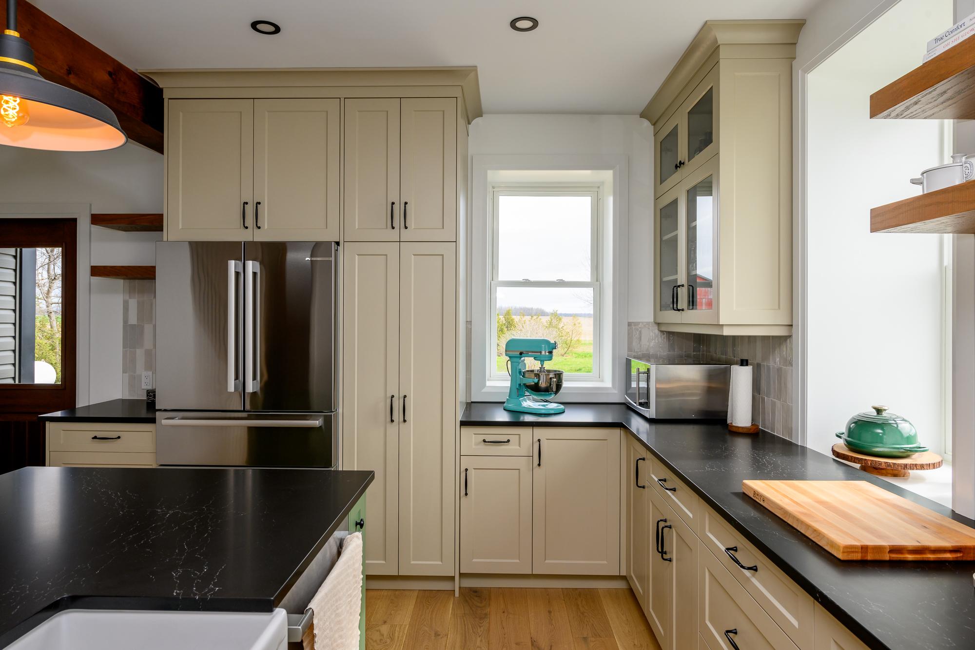 The interior of the Hesson Farm House was designed with a blend of authenticity and modern flair. The homeowner selected colors and finishes with guidance from Kitchen Appeal, ensuring that the cabinetry and hardware complemented the overall aesthetic. The flooring and tile work enhance the farmhouse’s country charm while incorporating contemporary elements.